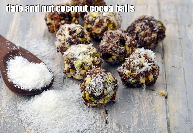 Date and Nut Coconut Cocoa Balls | healthy Indian date and coconut balls | choco coconut energy balls are great alternatives when you’re craving for fat laden ladoos and this one is loaded with omega-3 fats with no added sugar as it gets its sweetness from dates.