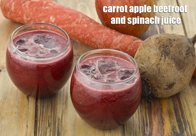 Brain booster in one drink you must try when concentration levels are dipping. Also great for kids doing exam. Called Brain Booster, Carrot Apple Beetroot and Spinach juice recipe | carrot apple beetroot and spinach juice recipe | beet spinach and carrot juice | carrot beet spinach juice benefits | healthy carrot beet detox juice where beetroots, carrots and spinach contain iron, folic acid and zinc, all of which improve the oxygen-carrying power of blood and thereby increase brainpower, concentration and memory.