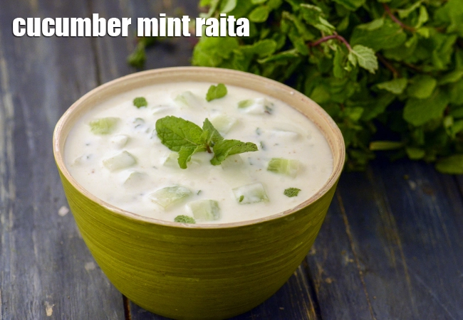 These low cholesterol raitas use low fat curds and no sugar in them. Try the mint flavoured cucumber mint raita | cucumber pudina raita | mint cucumber raita | healthy Indian cucumber mint raita.