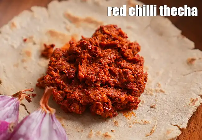 A classic Maharashtrian chutney, the Green Chilli Thecha goes best with Bhakri , Whole Wheat Bhakri and Jowar Bhakri and can be made in small batches and stored in the fridge for 2 to 3 days. For Breakfast, Red Chilli Thechha is had with Dashmi and often used as travel food.