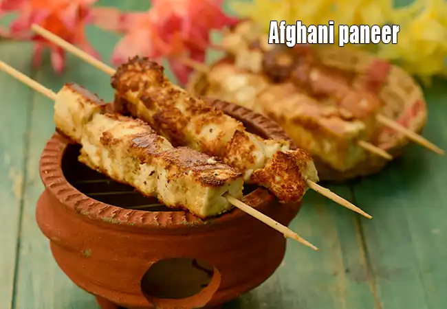 Afghani paneer tikka is also from the kitchens of Mughals. Learn how to make restaurant style Afghani paneer. The Mughal maharajas had an umpteen number of chefs who spent laborious hours toiling in the kitchens to prepare the perfect meal. They ground most ingredients to powders to ensure the perfect eating experience. The spice powder of this paneer Afghani, is a classic example of this.