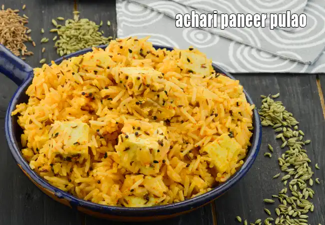 Achari paneer pulao is a perfect party fare. Paneer, marinated with achari spices like fennel and nigella is tossed together with rice, which is cooked to perfection with typical spices like cinnamon, cloves, cardamom and caraway. This gives the feeling of having a nice paneer tikka rice with a mild pickle, but it comes in a single package, making it convenient to serve or pack.