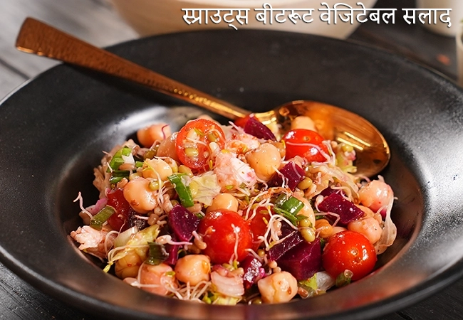 स्प्राउट्स बीटरूट वेजिटेबल सलाद रेसिपी | स्प्राउट्स फेटा चीज़ वेजिटेबल सलाद | चेरी टमाटर, स्प्राउट्स प्रोटीन और फाइबर युक्त सलाद
