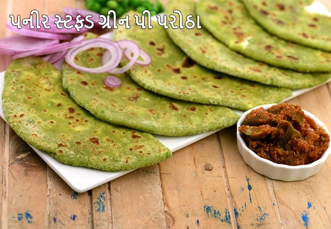 2. પનીર સ્ટફ્ડ ગ્રીન પી પરોઠા | ઘઉંના લોટની સાથે લીલા વટાણાના સંયોજન વડે તૈયાર થતી એક ખાસ પ્રકારની કણિક આ વાનગીની મુખ્ય અને મહત્વની જરૂરીયાત છે. તેમાં તાજું પનીર અને રસદાર કિસમિસ ઉમેરવાથી પરોઠા એક પથ્ય વાનગી બની રહે છે.