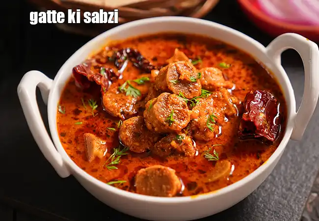 Gatte Ki Sabzi — steamed gram-flour dumplings simmered in a tangy curd-based curry; a signature dish that’s hearty yet vegetarian-friendly.