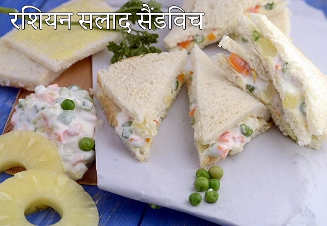 भारतीय शैली ठंडी रूसी सलाद सैंडविच आसानी से मेयोनेज़, ताज़ी क्रीम, मिश्रित सब्जियाँ, अनानास, आलू और ब्रेड से बनाई जाती है।