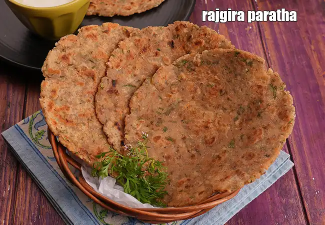 રાજગરા લોટ અને બટાકાથી બનેલો આ પરોઠો ગ્લૂટન-ફ્રી અને પોષક તત્વોથી ભરપૂર હોય છે। તેને દહીં અથવા મગફળીની ચટણી સાથે પીરસવામાં આવે છે।