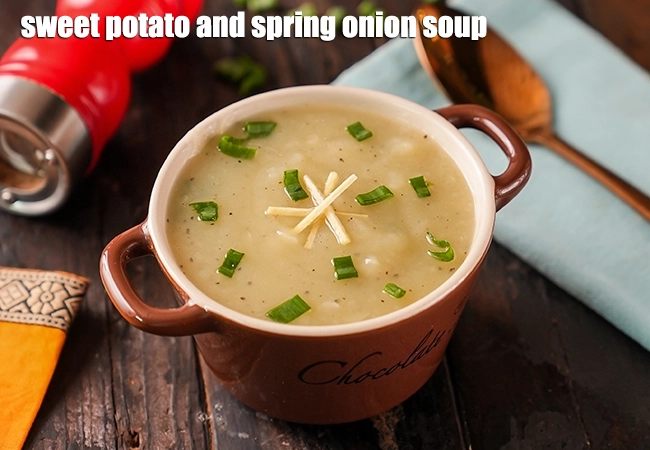 sweet potato and spring onion soup recipe | healthy sweet potato and onion soup | spring onion sweet potato soup |