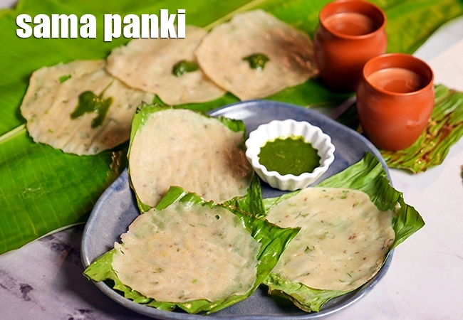 Sama Panki is a traditional Gujarati steamed dish made using sama rice batter. It is cooked between banana or pumpkin leaves, which give it a mild natural aroma. The dish is completely oil-free and very light on digestion. Sama panki is commonly prepared during fasting (vrat) days. It is soft in texture and mildly seasoned.