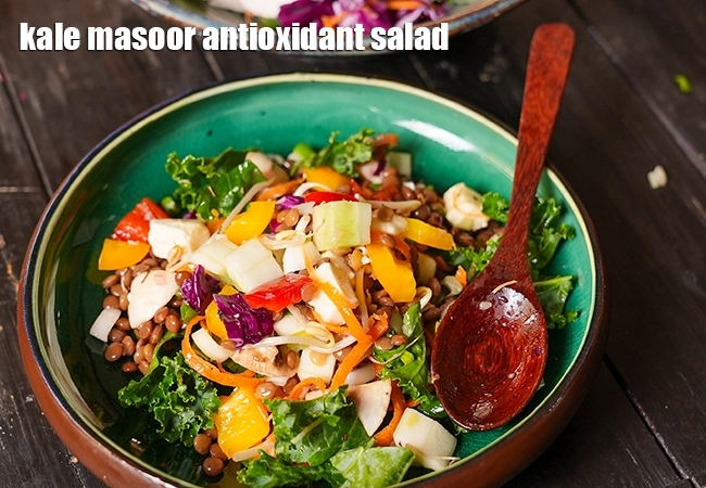So have your Kale with some olive oil or cook your Spinach in oil. Enjoy our kale masoor antioxidant salad recipe which is tossed with olive oil.