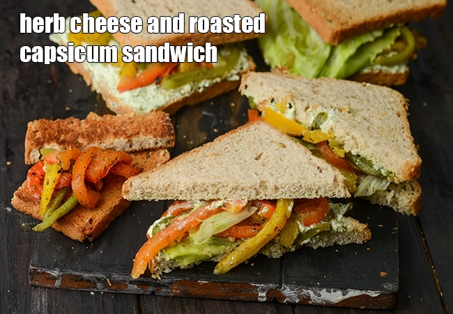 Herb cheese and roasted capsicum sandwich recipe | roasted pepper and paneer sandwich | Indian paneer capsicum sandwich is a simple and easy snack. Herb cheese made of paneer and an assortment of aromatic herbs is a lip-smacking spread or topping for any snack. Together with lettuce and roasted capsicum when sandwiched between whole wheat or multigrain bread slices, this Indian paneer capsicum sandwich is a calcium and antioxidant rich combo one cannot ignore.