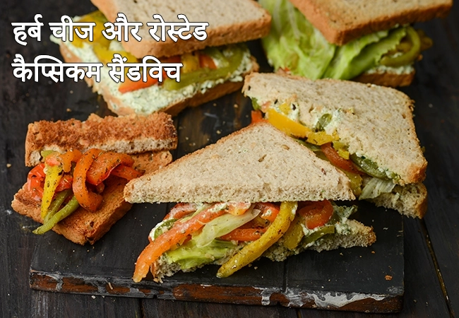 हर्ब चीज और रोस्टेड कैप्सिकम सैंडविच रेसिपी | रोस्टेड शिमला मिर्च और पनीर सैंडविच | भारतीय पनीर शिमला मिर्च सैंडविच एक सरल और आसान नाश्ता है। पनीर से बना हर्ब चीज़ और खुशबुसार हर्बस् का मेल एक बेहद स्वादिष्ट स्प्रैड या किसी भी नाश्ते के लिए मज़ेदार टॉपिंग बनाता है। लेट्यूस और भुनी हुई शिमला मिर्च के साथ जब पूरे गेहूं या मल्टीग्रेन ब्रेड स्लाइस के बीच सैंडविच किया जाता है, तो यह भारतीय पनीर शिमला मिर्च सैंडविच एक कैल्शियम और एंटीऑक्सीडेंट से भरपूर कॉम्बो है जिसे कोई भी नजरअंदाज नहीं कर सकता है।