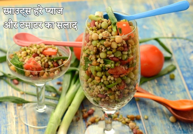 स्प्राउट्स हरे प्याज और टमाटर का सलाद की रेसिपी | स्प्राउट्स सलाद | हेल्दी सलाद | Sprouts, Spring Onion and Tomato Salad