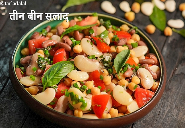 तीन बीन सलाद रेसिपी | थ्री बीन्स सलाद | राजमा, काबुली चना और रंगून ना वाल सलाद | स्वस्थ भारतीय राजमा, छोले और ब्रॉड फील्ड बीन्स सलाद | तीन बीन सलाद रेसिपी हिंदी में | three bean salad recipe in hindi |
