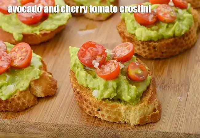 • avocado and cherry tomato crostini— Mash ripe avocado on whole-grain toast, top with cherry tomatoes, chili flakes, lemon juice, and optional feta or seeds. → Creamy, satisfying fats + fiber.