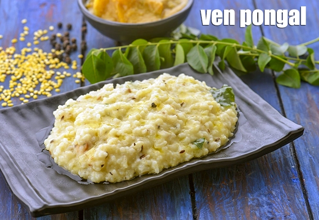 Ven Pongal | khara pongal | pongal South Indian breakfast recipe is South India’s equivalent of the North Indian khichdi. Cooked rice and moong dal are flavoured with ginger, crushed peppercorns and cumin seeds, and garnished with ghee-roasted cashew nuts and curry leaves.