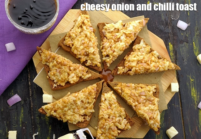 The best part about most open toasts is the melted gooey cheese. This simple Cheese Garlic Bread and Cheesy Onion and Chilli Toast made using a handful of ingredients are amazing snacking options. The combination of molten cheese, spiky spices and rich butter with crisp bread slices is indeed a magical experience for the taste buds.