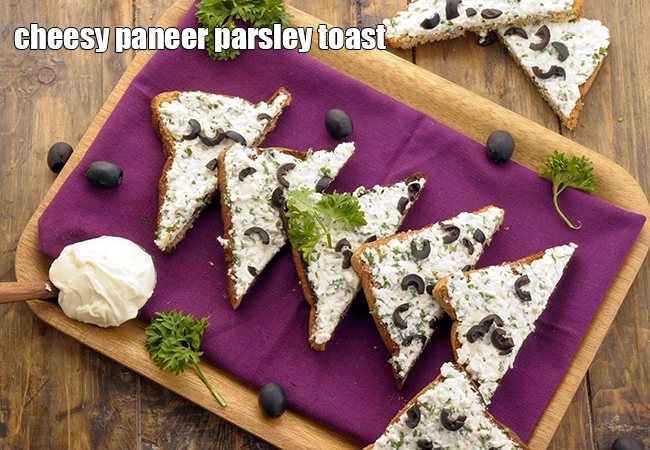 You can make a lusciously creamy mixture of spinach, paneer and cheese to make Palak Paneer Toast, Cheesy Paneer and Parsley Toast . Cut them into thin strips or small triangles and serve them as a party starter.