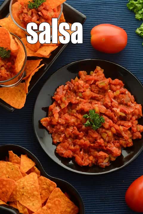 tomato salsa is a handy dish – you can serve it as a dip, as an accompaniment to snacks or innovatively use it in salads, pasta, pizzas and other creations.Popular in Mexican cuisine, it taste great with tortilla chips but can also be used inside Mexican wraps like Burrito and Paneer Tikki Salsa Wrap and also Mexican rice.. homemade tomato salsa is very easy to make and can also be made and stored in the freezer. It is basically a side dish!