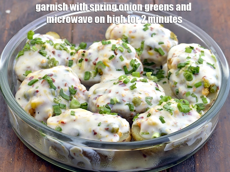 Next, prepare the sauce by mixing white sauce, grated cheese, red chilli flakes (paprika), dried oregano, and salt. This creamy and cheesy mixture adds richness to the stuffed potatoes, balancing the spice of the filling. Once ready, stuff each potato half generously with the vegetable mixture and arrange them in a microwave-safe dish. Pour the sauce evenly over the top so that it covers the filling and seeps into the potato shells, ensuring every bite is flavorful and indulgent.