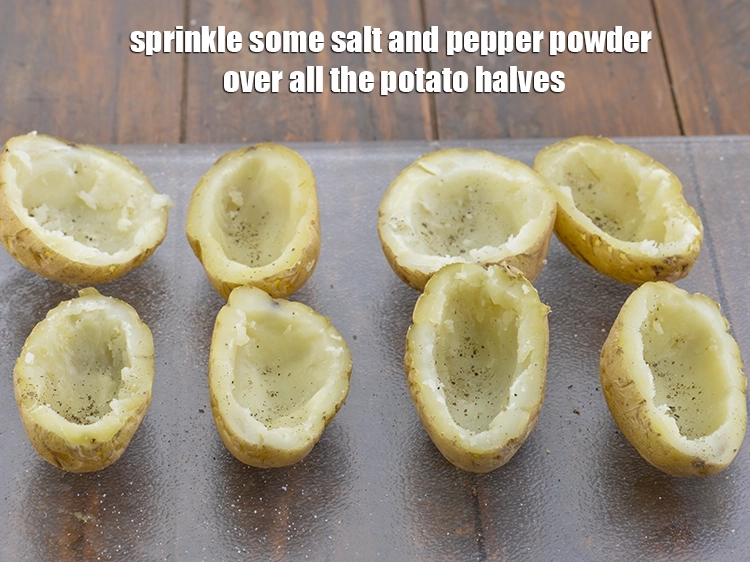 - Sprinkle some salt and pepper powder over all the potato halves. Keep aside.