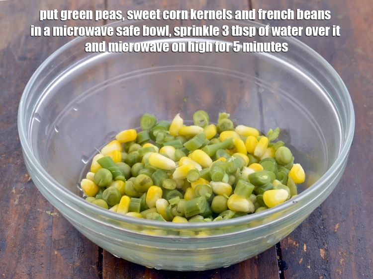 - Put the green peas, sweet corn kernels and french beans in a microwave safe bowl, sprinkle 3 tbsp of water over it and microwave on high for 5 minutes. Keep aside.