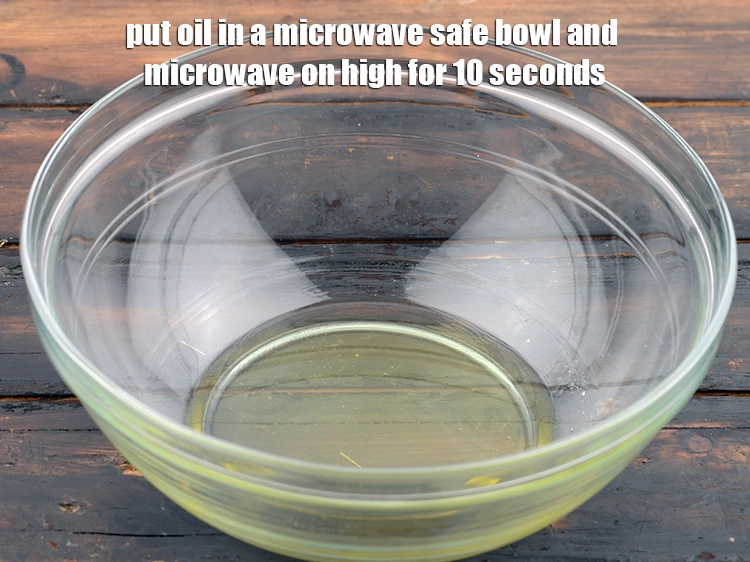 - Put the oil in a microwave safe bowl and microwave on high for 10 seconds.