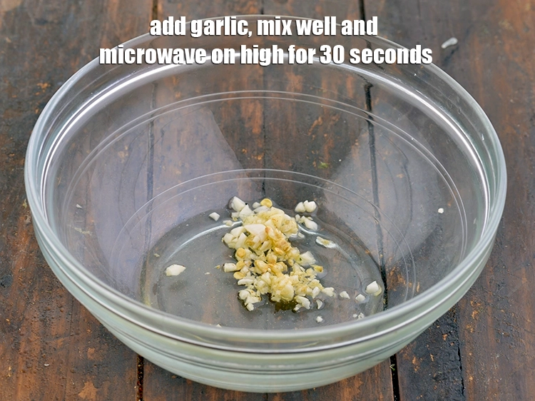 - Add the garlic, mix well and microwave on high for 30 seconds.