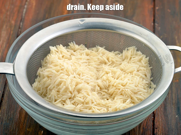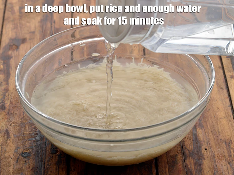 - Combine the rice and enough water in a deep bowl and soak for 15 minutes. Drain. Keep aside.